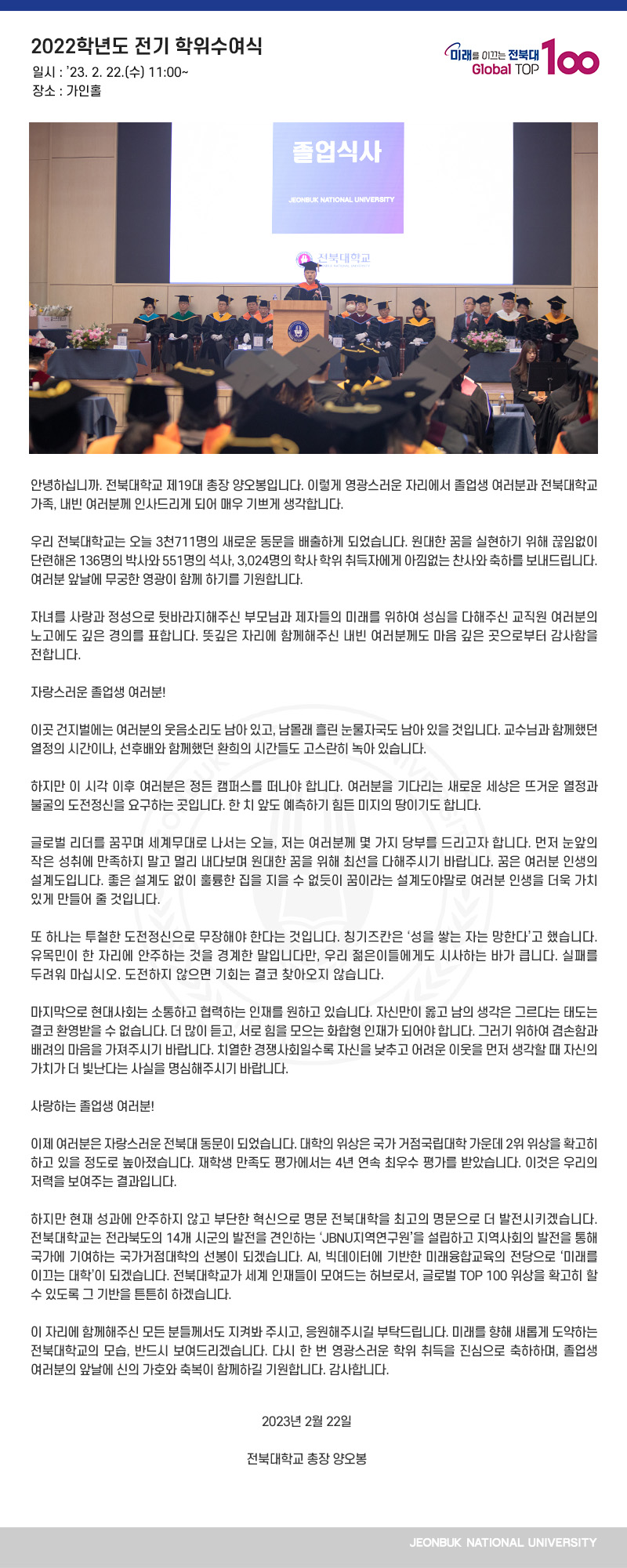 우리 전북대학교는 오늘 3천711명의 새로운 동문을 배출하게 되었습니다. 원대한 꿈을 실현하기 위해 끊임없이 단련해온 136명의 박사와 551명의 석사, 3,024명의 학사 학위 취득자에게 아낌없는 찬사와 축하를 보내드립니다. 여러분 앞날에 무궁한 영광이 함께 하기를 기원합니다.