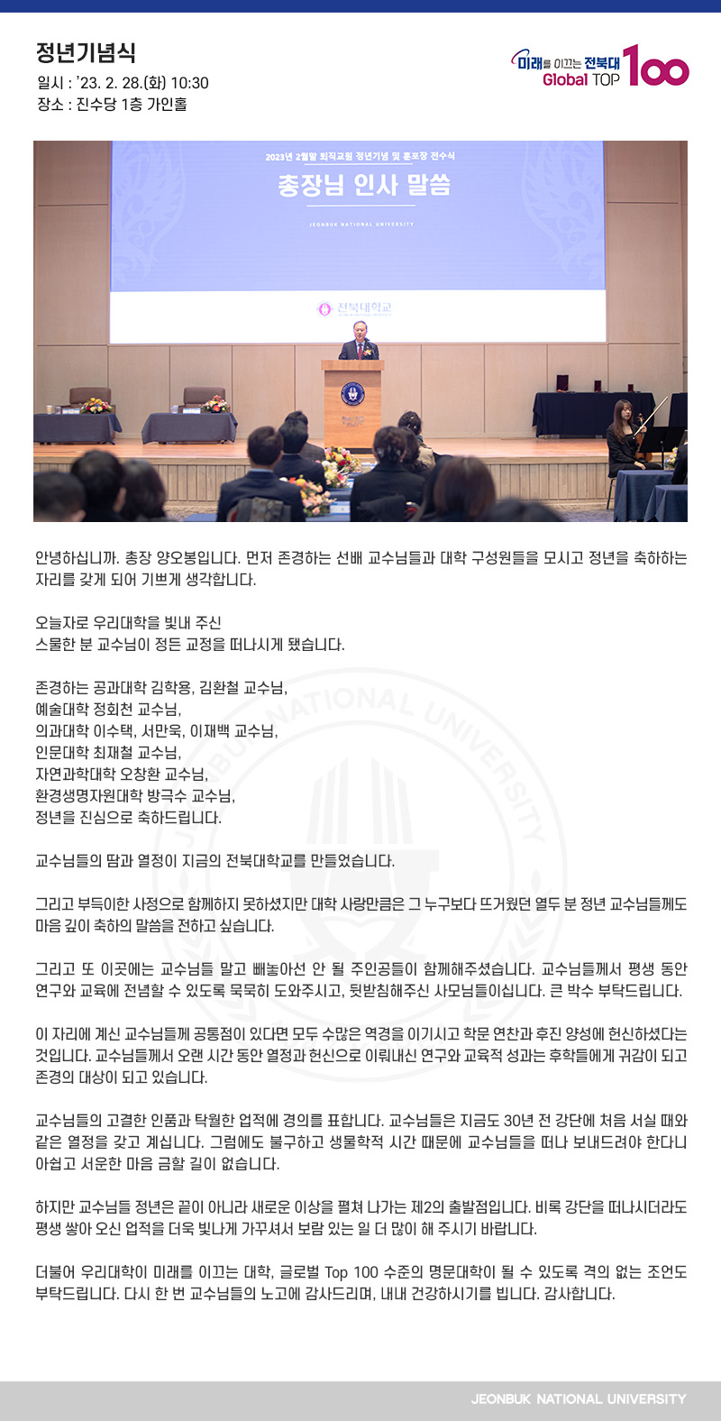 안녕하십니까. 총장 양오봉입니다. 먼저 존경하는 선배 교수님들과 대학 구성원들을 모시고 정년을 축하하는 자리를 갖게 되어 기쁘게 생각합니다. 오늘자로 우리대학을 빛내 주신 스물한 분 교수님이 정든 교정을 떠나시게 됐습니다. 존경하는 공과대학 김학용, 김환철 교수님, 예술대학 정회천 교수님, 의과대학 이수택, 서만욱, 이재백 교수님, 인문대학 최재철 교수님, 자연과학대학 오창환 교수님, 환경생명자원대학 방극수 교수님, 정년을 진심으로 축하드립니다. 교수님들의 땀과 열정이 지금의 전북대학교를 만들었습니다. 그리고 부득이한 사정으로 함께하지 못하셨지만 대학 사랑만큼은 그 누구보다 뜨거웠던 열두 분 정년 교수님들께도 마음 깊이 축하의 말씀을 전하고 싶습니다. 그리고 또 이곳에는 교수님들 말고 빼놓아선 안 될 주인공들이 함께해주셨습니다. 교수님들께서 평생 동안 연구와 교육에 전념할 수 있도록 묵묵히 도와주시고, 뒷받침해주신 사모님들이십니다. 큰 박수 부탁드립니다. 이 자리에 계신 교수님들께 공통점이 있다면 모두 수많은 역경을 이기시고 학문 연찬과 후진 양성에 헌신하셨다는 것입니다. 교수님들께서 오랜 시간 동안 열정과 헌신으로 이뤄내신 연구와 교육적 성과는 후학들에게 귀감이 되고 존경의 대상이 되고 있습니다. 교수님들의 고결한 인품과 탁월한 업적에 경의를 표합니다. 교수님들은 지금도 30년 전 강단에 처음 서실 때와 같은 열정을 갖고 계십니다. 그럼에도 불구하고 생물학적 시간 때문에 교수님들을 떠나 보내드려야 한다니 아쉽고 서운한 마음 금할 길이 없습니다. 하지만 교수님들 정년은 끝이 아니라 새로운 이상을 펼쳐 나가는 제2의 출발점입니다. 비록 강단을 떠나시더라도 평생 쌓아 오신 업적을 더욱 빛나게 가꾸셔서 보람 있는 일 더 많이 해 주시기 바랍니다. 더불어 우리대학이 미래를 이끄는 대학, 글로벌 Top 100 수준의 명문대학이 될 수 있도록 격의 없는 조언도 부탁드립니다. 다시 한 번 교수님들의 노고에 감사드리며, 내내 건강하시기를 빕니다. 감사합니다.