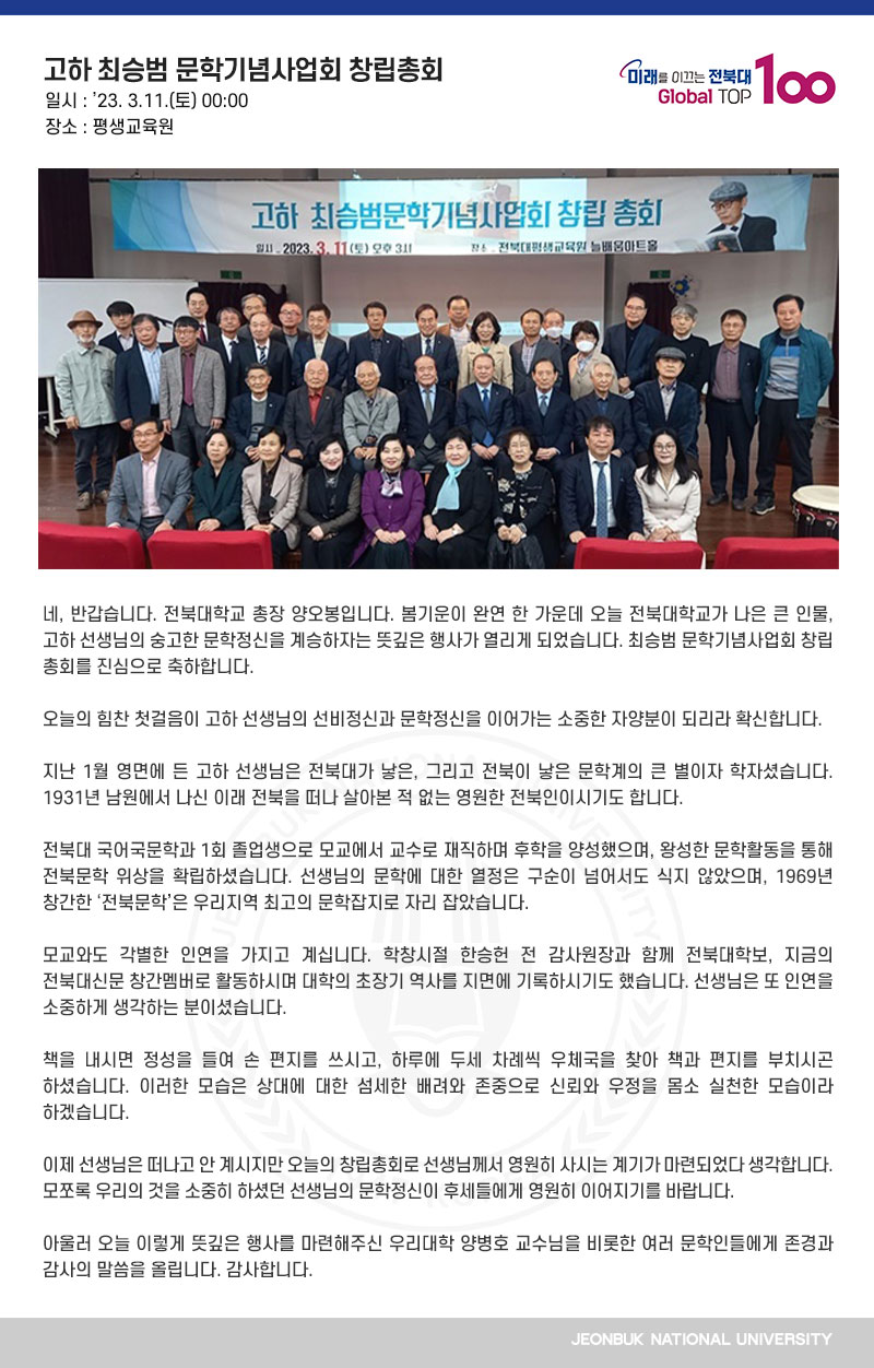 네, 반갑습니다. 전북대학교 총장 양오봉입니다. 봄기운이 완연 한 가운데 오늘 전북대학교가 나은 큰 인물, 고하 선생님의 숭고한 문학정신을 계승하자는 뜻깊은 행사가 열리게 되었습니다. 최승범 문학기념사업회 창립 총회를 진심으로 축하합니다. 오늘의 힘찬 첫걸음이 고하 선생님의 선비정신과 문학정신을 이어가는 소중한 자양분이 되리라 확신합니다. 지난 1월 영면에 든 고하 선생님은 전북대가 낳은, 그리고 전북이 낳은 문학계의 큰 별이자 학자셨습니다. 1931년 남원에서 나신 이래 전북을 떠나 살아본 적 없는 영원한 전북인이시기도 합니다. 전북대 국어국문학과 1회 졸업생으로 모교에서 교수로 재직하며 후학을 양성했으며, 왕성한 문학활동을 통해 전북문학 위상을 확립하셨습니다. 선생님의 문학에 대한 열정은 구순이 넘어서도 식지 않았으며, 1969년 창간한 ‘전북문학’은 우리지역 최고의 문학잡지로 자리 잡았습니다. 모교와도 각별한 인연을 가지고 계십니다. 학창시절 한승헌 전 감사원장과 함께 전북대학보, 지금의 전북대신문 창간멤버로 활동하시며 대학의 초장기 역사를 지면에 기록하시기도 했습니다. 선생님은 또 인연을 소중하게 생각하는 분이셨습니다. 책을 내시면 정성을 들여 손 편지를 쓰시고, 하루에 두세 차례씩 우체국을 찾아 책과 편지를 부치시곤 하셨습니다. 이러한 모습은 상대에 대한 섬세한 배려와 존중으로 신뢰와 우정을 몸소 실천한 모습이라 하겠습니다. 이제 선생님은 떠나고 안 계시지만 오늘의 창립총회로 선생님께서 영원히 사시는 계기가 마련되었다 생각합니다. 모쪼록 우리의 것을 소중히 하셨던 선생님의 문학정신이 후세들에게 영원히 이어지기를 바랍니다. 아울러 오늘 이렇게 뜻깊은 행사를 마련해주신 우리대학 양병호 교수님을 비롯한 여러 문학인들에게 존경과 감사의 말씀을 올립니다. 감사합니다.