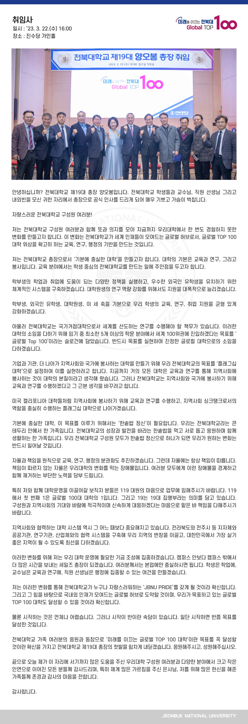 전북대학교 가족 여러분의 응원과 동참으로 ‘미래를 이끄는 글로벌 TOP 100 대학’이란 목표를 꼭 달성할 것이란 확신을 가지고 전북대학교 제19대 총장의 첫발을 힘차게 내딛겠습니다. 응원해주시고, 성원해주십시오.