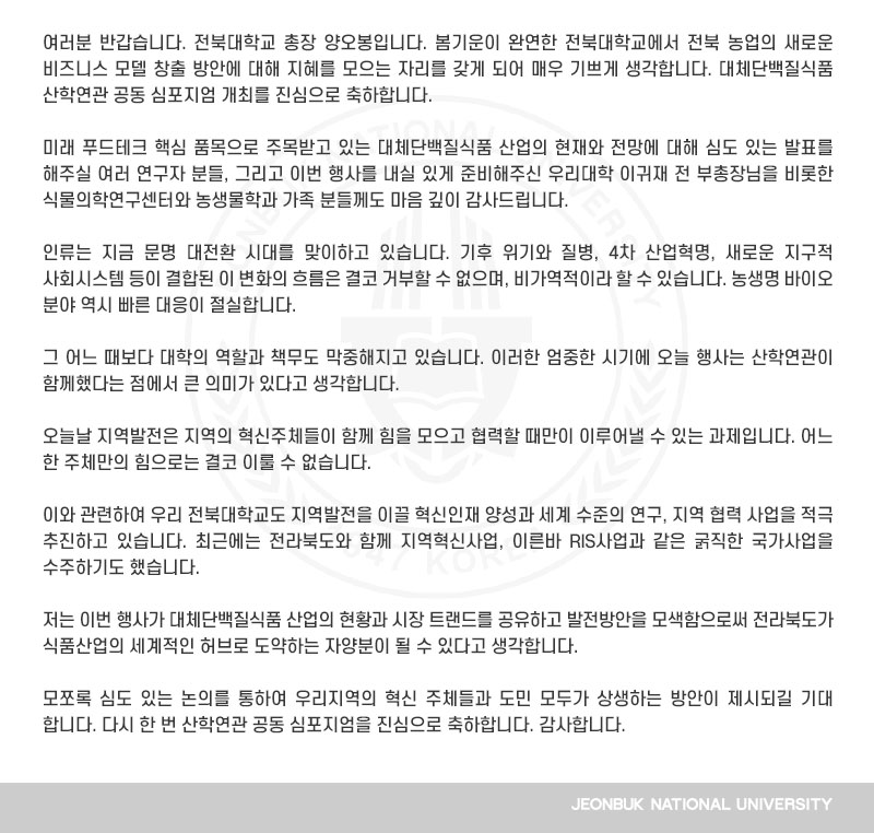 여러분 반갑습니다. 전북대학교 총장 양오봉입니다. 봄기운이 완연한 전북대학교에서 전북 농업의 새로운 비즈니스 모델 창출 방안에 대해 지혜를 모으는 자리를 갖게 되어 매우 기쁘게 생각합니다. 대체단백질식품 산학연관 공동 심포지엄 개최를 진심으로 축하합니다. 미래 푸드테크 핵심 품목으로 주목받고 있는 대체단백질식품 산업의 현재와 전망에 대해 심도 있는 발표를 해주실 여러 연구자 분들, 그리고 이번 행사를 내실 있게 준비해주신 우리대학 이귀재 전 부총장님을 비롯한 식물의학연구센터와 농생물학과 가족 분들께도 마음 깊이 감사드립니다. 인류는 지금 문명 대전환 시대를 맞이하고 있습니다. 기후 위기와 질병, 4차 산업혁명, 새로운 지구적 사회시스템 등이 결합된 이 변화의 흐름은 결코 거부할 수 없으며, 비가역적이라 할 수 있습니다. 농생명 바이오 분야 역시 빠른 대응이 절실합니다. 그 어느 때보다 대학의 역할과 책무도 막중해지고 있습니다. 이러한 엄중한 시기에 오늘 행사는 산학연관이 함께했다는 점에서 큰 의미가 있다고 생각합니다. 오늘날 지역발전은 지역의 혁신주체들이 함께 힘을 모으고 협력할 때만이 이루어낼 수 있는 과제입니다. 어느 한 주체만의 힘으로는 결코 이룰 수 없습니다. 이와 관련하여 우리 전북대학교도 지역발전을 이끌 혁신인재 양성과 세계 수준의 연구, 지역 협력 사업을 적극 추진하고 있습니다. 최근에는 전라북도와 함께 지역혁신사업, 이른바 RIS사업과 같은 굵직한 국가사업을 수주하기도 했습니다. 저는 이번 행사가 대체단백질식품 산업의 현황과 시장 트랜드를 공유하고 발전방안을 모색함으로써 전라북도가 식품산업의 세계적인 허브로 도약하는 자양분이 될 수 있다고 생각합니다. 모쪼록 심도 있는 논의를 통하여 우리지역의 혁신 주체들과 도민 모두가 상생하는 방안이 제시되길 기대합니다. 다시 한 번 산학연관 공동 심포지엄을 진심으로 축하합니다. 감사합니다.