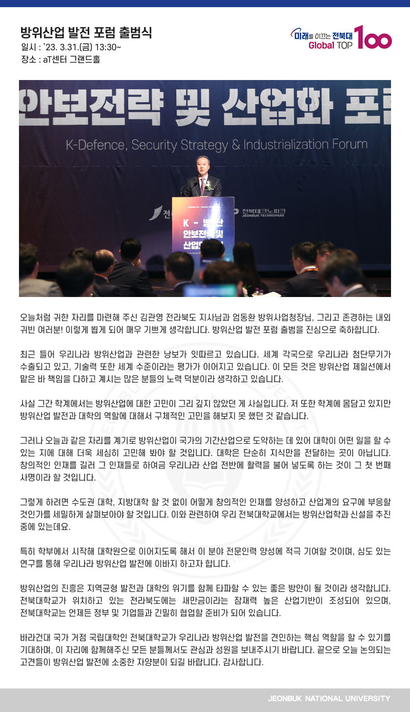 바라건대 국가 거점 국립대학인 전북대학교가 우리나라 방위산업 발전을 견인하는 핵심 역할을 할 수 있기를 기대하며, 이 자리에 함께해주신 모든 분들께서도 관심과 성원을 보내주시기 바랍니다. 끝으로 오늘 논의되는 고견들이 방위산업 발전에 소중한 자양분이 되길 바랍니다. 감사합니다.