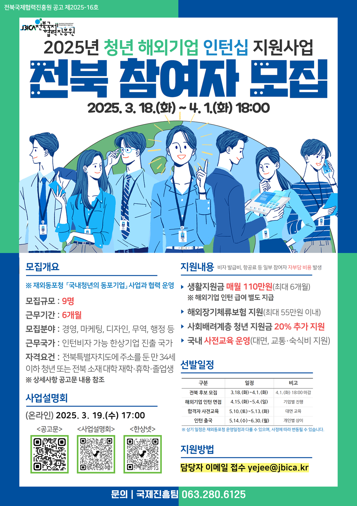 2025년 청년 해외기업 인턴십 지원사업 전북 참여자 모집(3.18.~4.1.)
