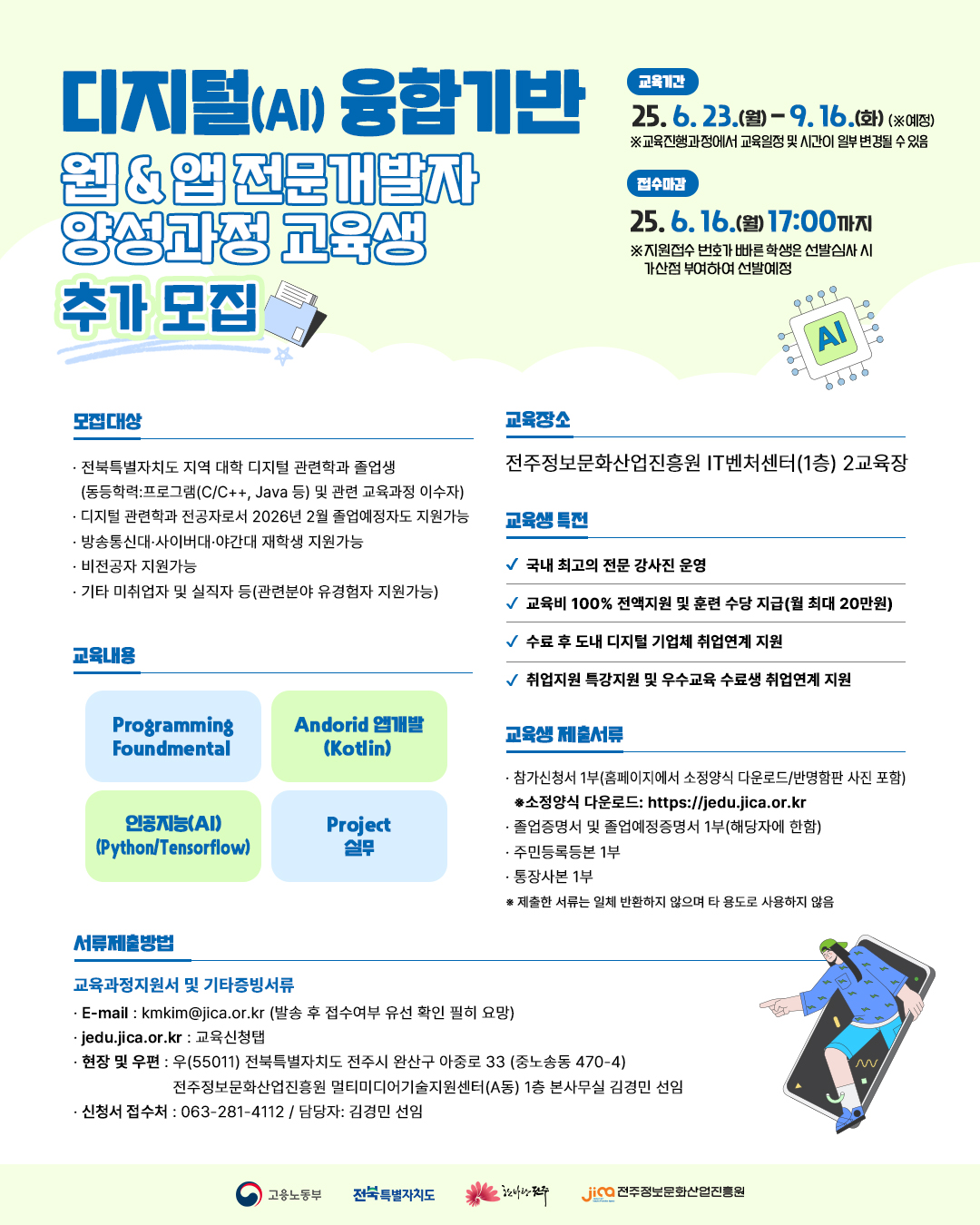 AI 융합기반 웹 & 앱 전문 개발자로 성장할 교육생분들을 모집합니다 (100% 무료교육, 취업연계지원) 🤖