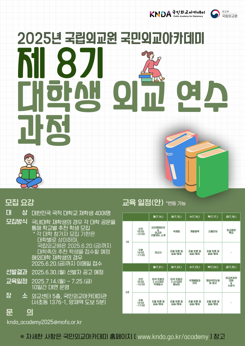 위와 관련하여 2025년 제8기 국민외교아카데미 대학생 외교 연수 과정이 아래와 같이 진행될 예정이오니, 희망하는 학생들은 각 단과 대학에 6.13.(금)까지 신청하여 주시기 바랍니다.