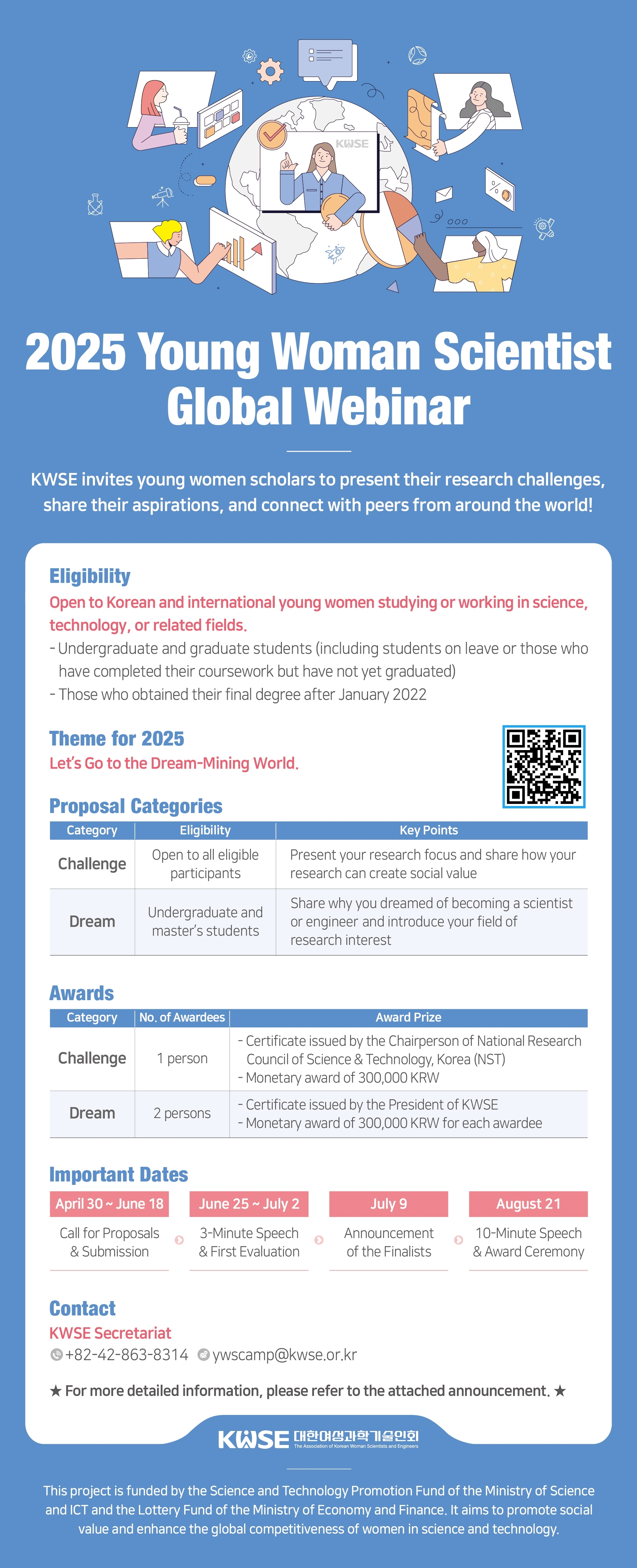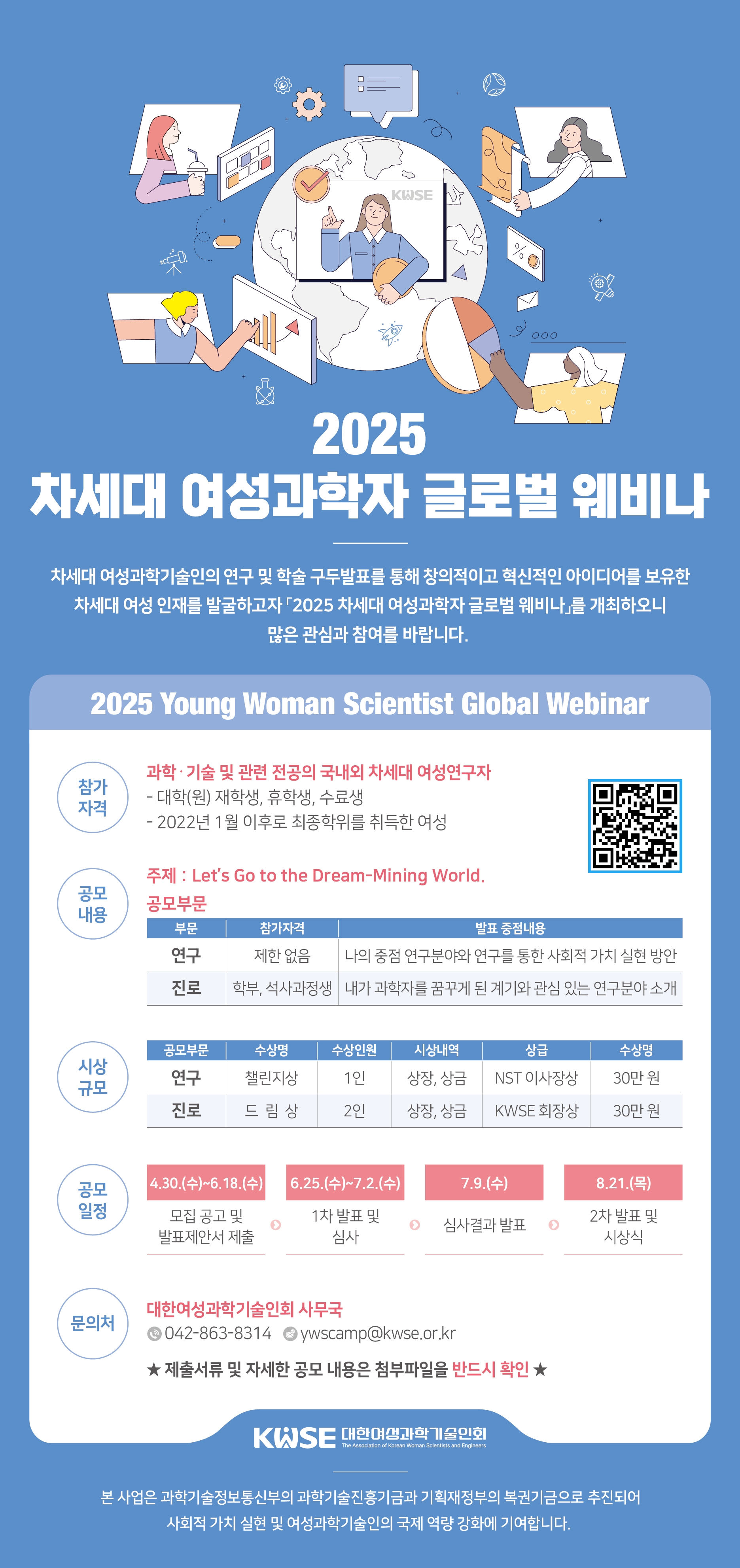 대한여성과학기술인회에서 2025 차세대 여성과학자 글로벌 웨비나 공모전을 개최합니다. 관심있는 학생들은 많은 참여 바랍니다.
