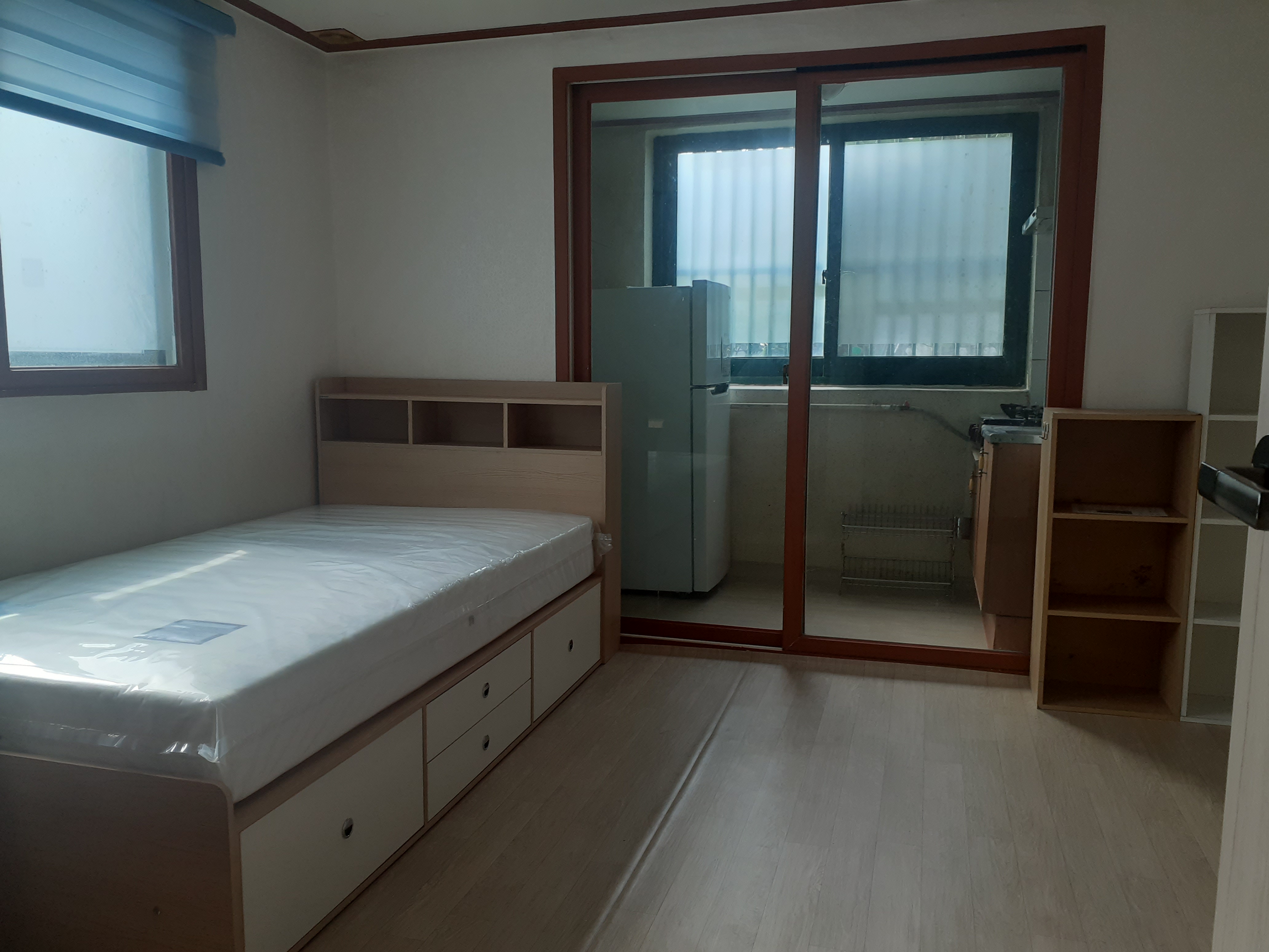 창문이 이중창인데 바깥쪽은 투명 안쪽은 불투명으로 했습니다 그리고 블라인드도 설치해서 개인의 프라이버시가 완벽히 보호됩니다