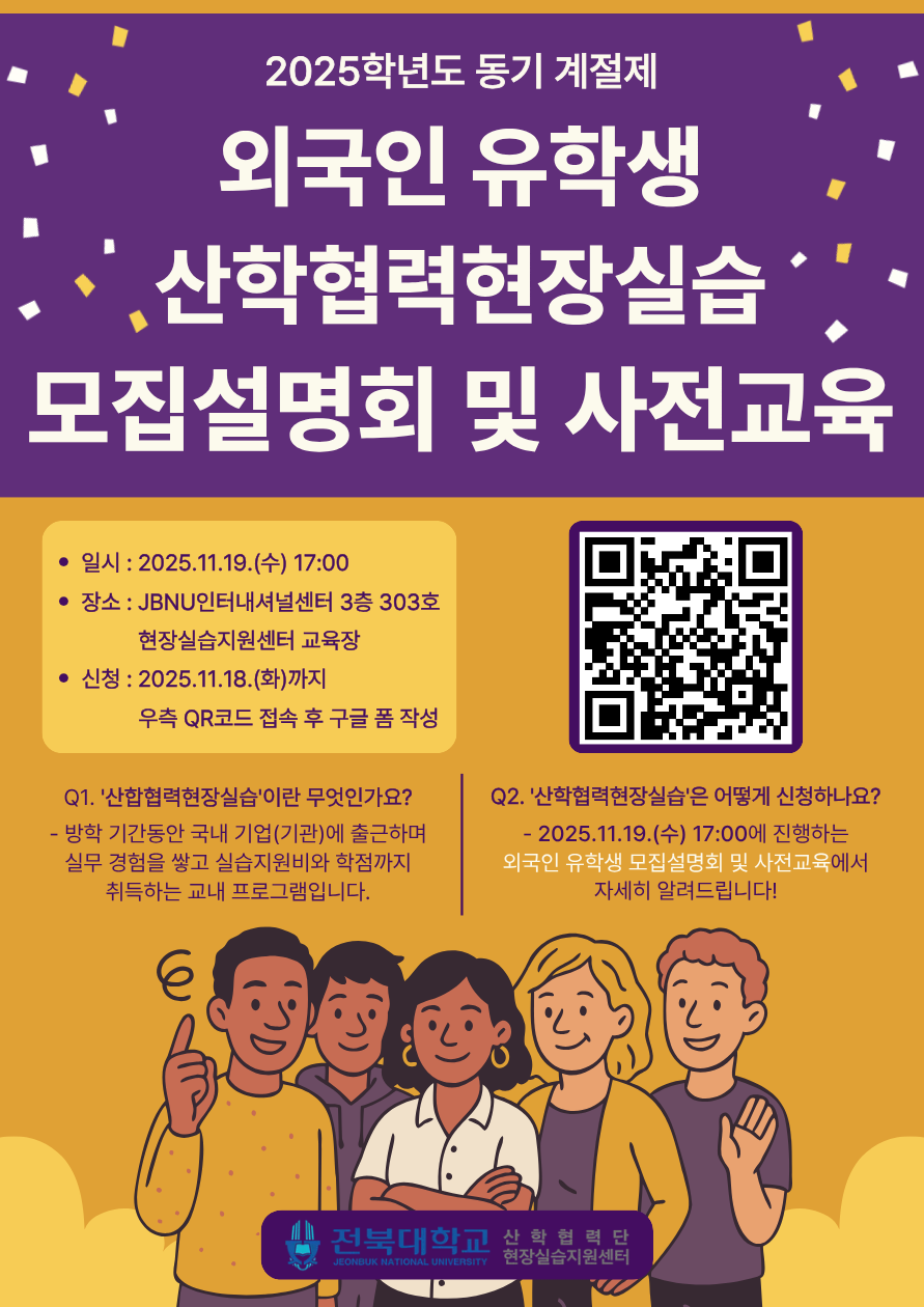 [현장실습지원센터] 2025학년도 동기 계절제 외국인 유학생 산학협력현장실습 모집설명회 및 사전교육 안내