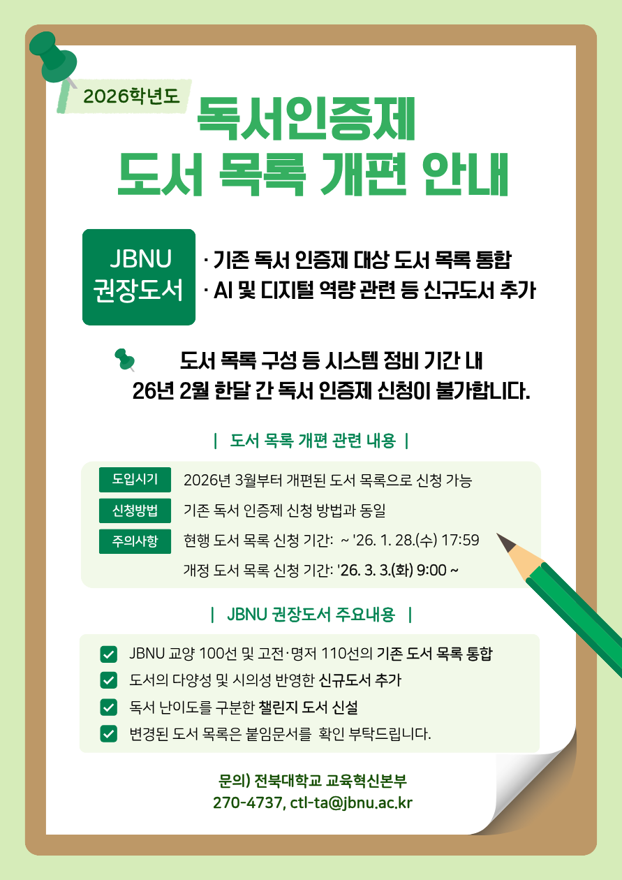 2026년 3월부터, 개편된 독서 인증제 도서 목록으로 독서 인증제가 시행됩니다.